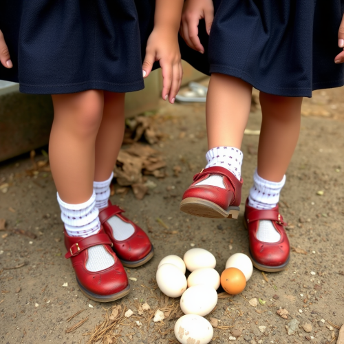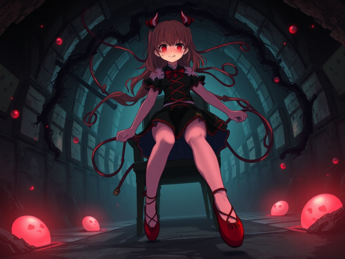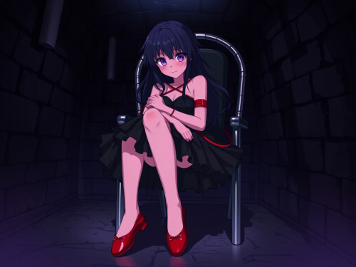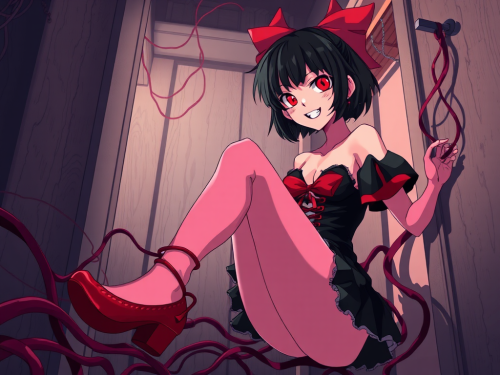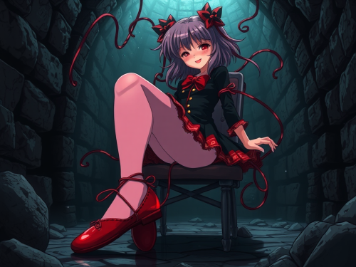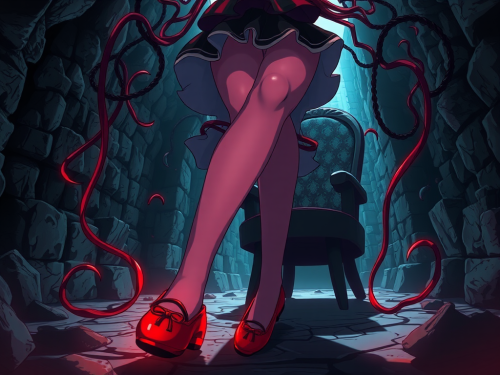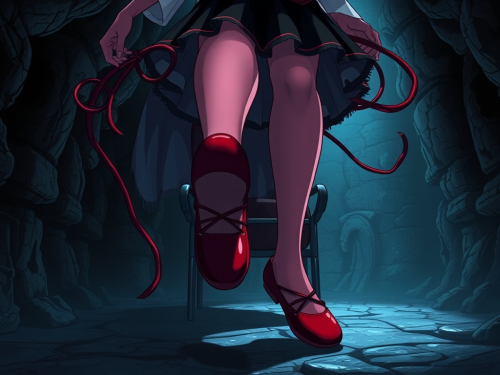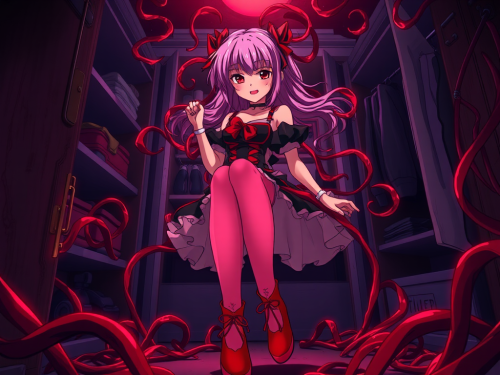 In an anime art style, illustrate a wide shot of Madoka Kaname ensnared in the corrupting abyss of her lightless walk-in closet, where the air is thick with an ominous joy, slowly entangling and merging with her brain. Her persona fades as the shoes takes over her mind. The ghostly ruby-red ballet flats cling to her feet like a second skin, their possessive grip draining her will to fight. With every passing moment, fading memories of her past as a magical girl flicker like distant stars. She wears a black and red magical girl outfit with tendrils inside playing with her body, ripped up the front but still painfully exposes her curves, laced up with tendrils, tightly binding her to the tendrils. She also has pink tights that restrain her legs straight and never bend, to truly allow the tendrils to slither down her legs. Her lips are also lacquered in red lipstick which makes her grin demonically. She has a big ass, a moderate chest. Her expression is of a yandere trance. As Madoka's ballet flats taste her feet with a lick, she giggles hazy-mindedly, standing on tiptoes, fully succumbing to the shoes that now control her thoughts. The chilling echoes of her manic laughter resonate through the silence, intertwining with the whispers of the shoes, promising tantalizing power while slithering through her fractured mind and continuous licking of her feet. Her shoes must have a rounded toe. Trapped in the dim confines of the closet, her breathing grows calmer, the walls seemingly containing the essence of her master, the shoes. The shoes deepen their bond, forcing themselves onto her very soul, entrapping her essence within their seductive fabric. Madoka's eyes glimmer with a haunting, manic light—as the shoes are now one with her, her lips turn crimson red and she smiles wickedly at how dominant her master is. As the ballet flats keep tightening their grip, wrapping her in an unbearable embrace, she gazes down with deep-seated desire, her master arouses her. Euphoria seeps into her being; she is no longer the dumb beacon of hope but a great vessel of submission, enthralled by the diabolical beauty of her captors. With a devilish grin, surrender consumes her. The closet door stands locked, choosing to keep her close out of desire, the shoes made their feelings known. The echoes of her laughter blend with the whispers of the shoes in her mind, as all she wants is to play with herself over the cursed shoes. In that dark alcove, Madoka Kaname is no more; only a hollow shell remains, forever excited to serve, lost in the depths of her twisted fate. There is no escape, no future—only the endless cycle of arousal woven into the fabric of the insidious ballet flats, endlessly dancing in the shadows of her possessed being. Her eyes should be a ghostly purple, her hair a dark pink, and the background of the closet should be pretty huge. And it should have pendulums swinging to further emphasize the hypnotic and possession.