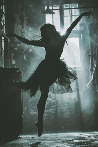 full body film photograph of a ballerina dancing frantically, dynamic pose, barefoot, skewed angle, distorted perspective, possessed by demons, creepypasta, unsettling, dark, flash on, high contrast, movement --ar 2:3 --style raw --v 6.0