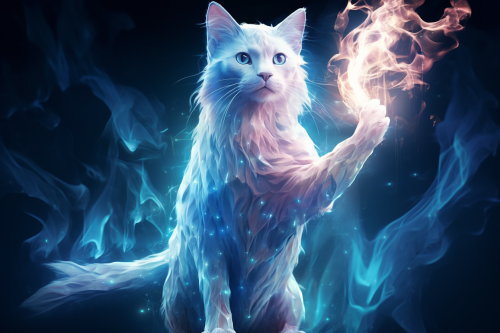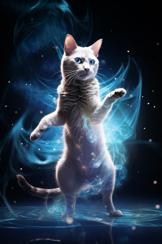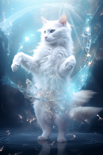 cat with point-shoes dancing ballet in the style of light white and light azure, necronomicon illustrations, uhd image, swirling vortexes, energy-filled illustrations, aurorapunk, characterized animals --ar 2:3