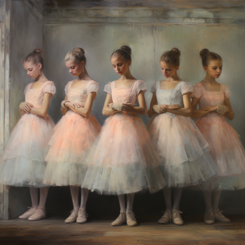 5 ballerinas age 15 dressed in full fluffy white and soft pastels tutus skirts and flat ballerina slippers. some face showing, some profile stance, some twirling. Natural hair and features. Painted in heavy oil painting style of Degas, inside a large old fashioned natural light dance studio. High quality. Soft pastels --s 750
