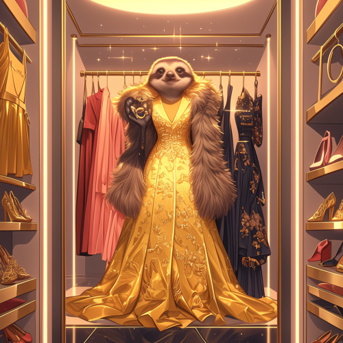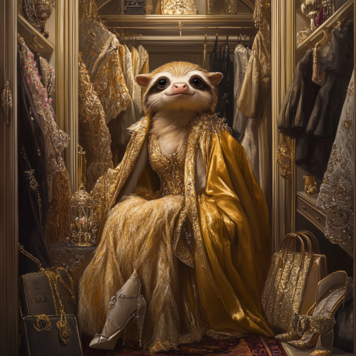 Create a luxurious and glamorous portrait of Sassy Sloth in a massive walk-in closet filled with high-end luxury gowns, clothing, and accessories. The scene should evoke the opulence and style of an SATC movie. Sassy Sloth is dressed to the nines in couture, striking a confident and fashionable pose. The closet is adorned with designer shoes, handbags, and jewelry, with everything arranged elegantly. The overall aesthetic should be sophisticated, chic, and dripping with luxury, showcasing Sassy Sloth as the epitome of style and grace