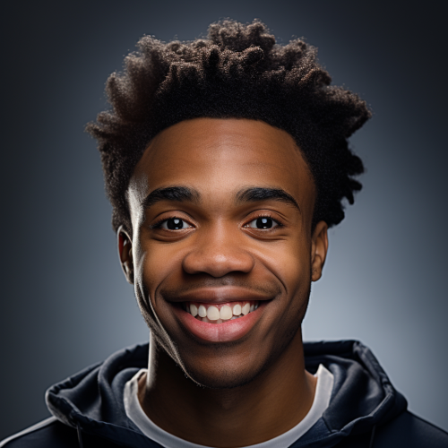 very detailed headshot from neck up fitting all of head and hair in frame wearing a Ice Hockey Jersey, Black Male Ice Hockey player aged 28, He has stubby hair. His face is shaped and he has a look. His eyes are , with eyebrows that give him a happy and fun expression. He has a nose and smiling lips.
