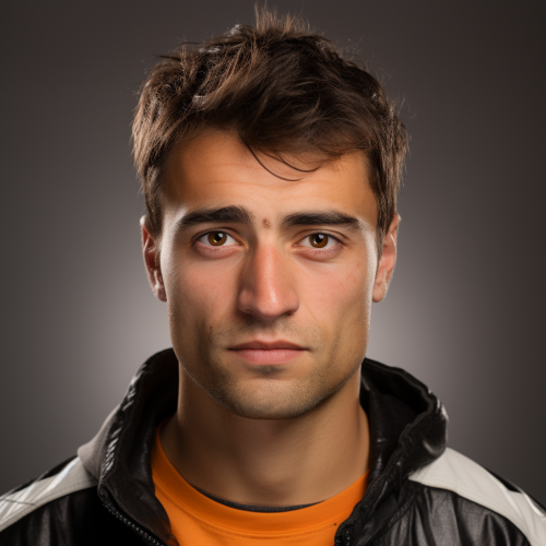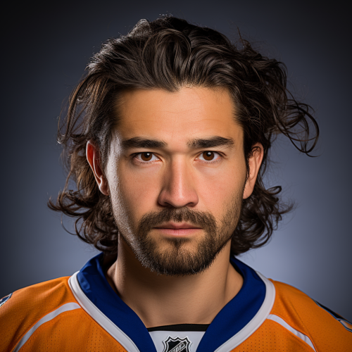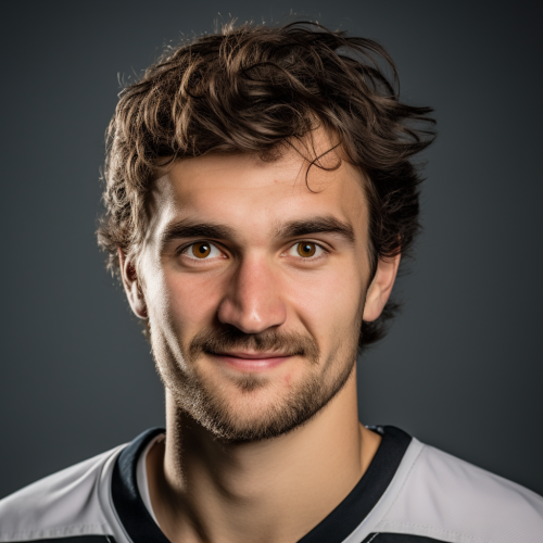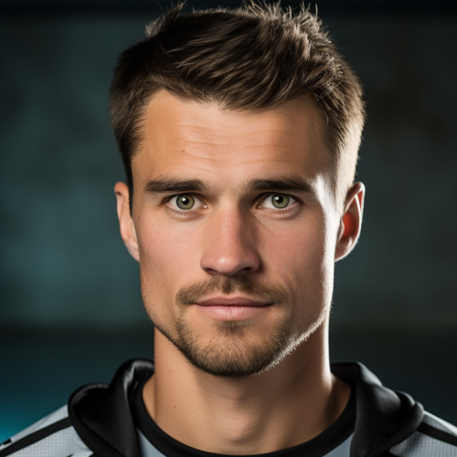 very detailed headshot from neck up fitting all of head and hair in frame wearing an Ice Hockey Jersey,german Ice Hockey player aged 29. He has a cool haircut. His face is slim with a stern look. His eyes are small, with bushy eyebrows that give him a determined and tired expression. He has a small nose, and his lips are smiling. He has a big beard.