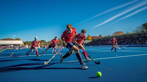 field hockey game, 2 players one in blue the other in red. the blue players has the ball and is running down the pitch ball to his right hand side, and the red player is attempting a tackle from the blue players left hand side not engaged but ready to jab the ball away. sunny day blue sky, blue astro pitch surface. We can see the whole of the players bodies, 4K --ar 16:9 --s 50 --v 5.1