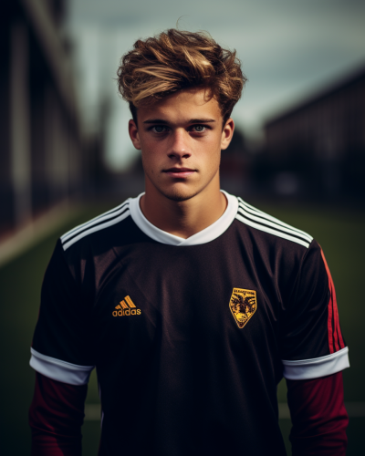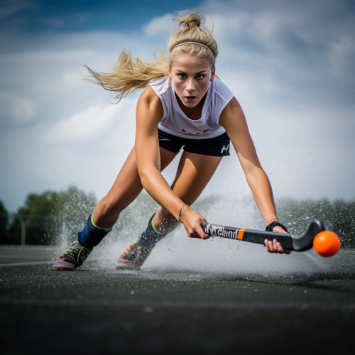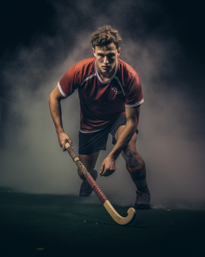 A german male 16 year old hockey player is playing field hockey, professional spots fotograf, no edit, natural colors, winning emotions --ar 4:5