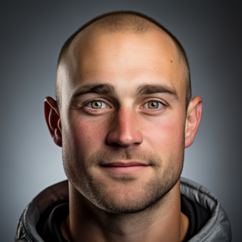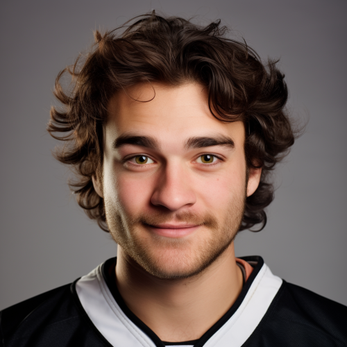 very detailed headshot from neck up fitting all of head and hair in frame wearing a Ice Hockey Jersey, american Male Ice Hockey player aged 29, He has buzzcut hair. His face is round-shaped and he has a slim look. His eyes are tired, with slanted eyebrows that give him a happy and fun expression. He has a predominant nose and smiling lips and pimples.