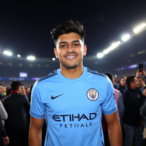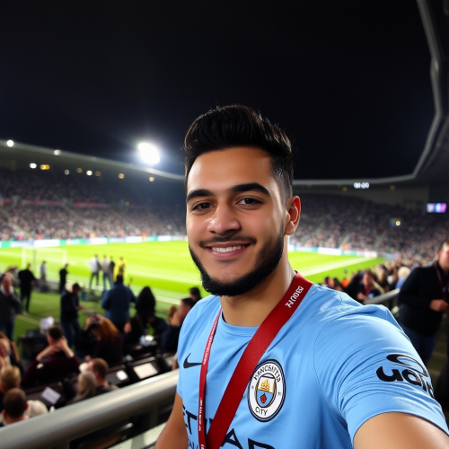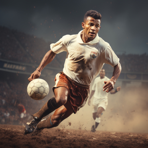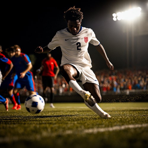 Create a highly detailed photograph capturing the moment immediately after a soccer player has evaded an opponent's pursuit and taken a shot at the goal. Focus on the player's expression of determination and intensity, with the ball in motion toward the goal. The background should include a dynamic stadium atmosphere with cheering fans, highlighting the excitement of the match