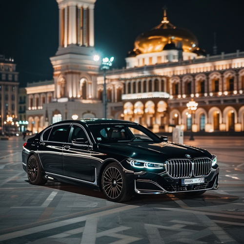 black Bmw 7 series on custom discs of 22 sizes. Against the background of Amir Temur Square at night. --v 6.0