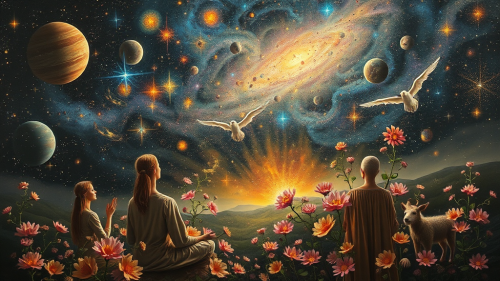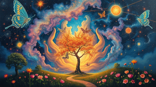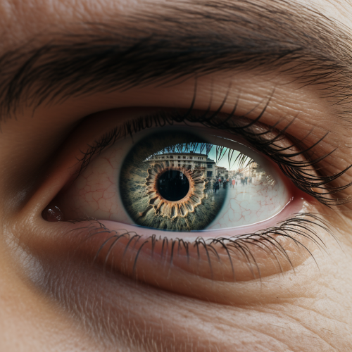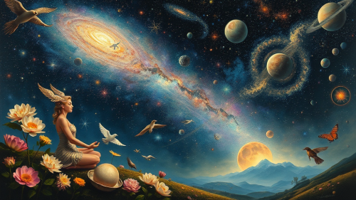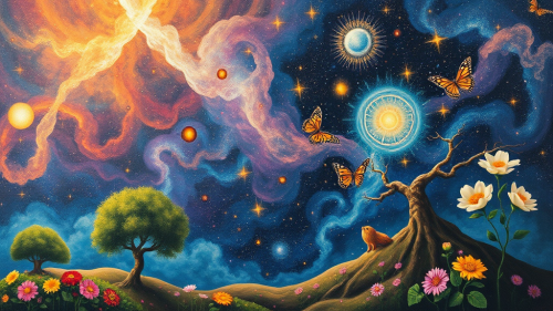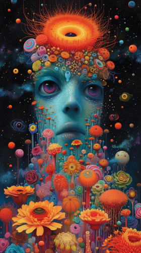 Create a surreal painting with a large eye in the center. This eye should be detailed and expressive, reflecting the infinite cosmos, with stars and galaxies visible in the iris. Drops should cascade from the eye, each containing miniature scenes from different worlds, from bright and colorful to dark and mysterious. These drops, like tears, flow down the surface, creating the effect of reflecting emotions and memories. The background of the painting should be mystical, incorporating elements of outer space to add depth and atmosphere. Use bright and contrasting colors to emphasize the surreal nature of the artwork.