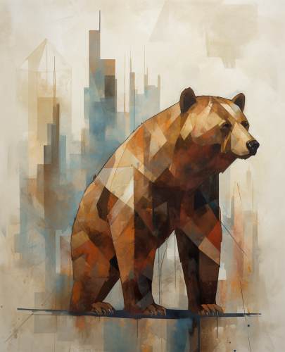 painting of an abstract bear, standing on its hind legs, with a background that includes cityscape elements. The style is expressive and minimalistic, using geometric shapes to represent the form of both the animal and the urban environment. This artwork uses a color palette of earthy tones for depth against a white canvas. --ar 13:16 --v 5.0 --s 750