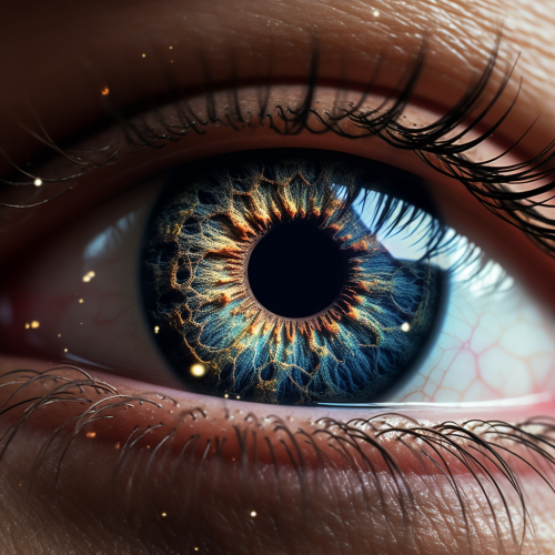 Surreal painting with expressive eye reflecting cosmos.