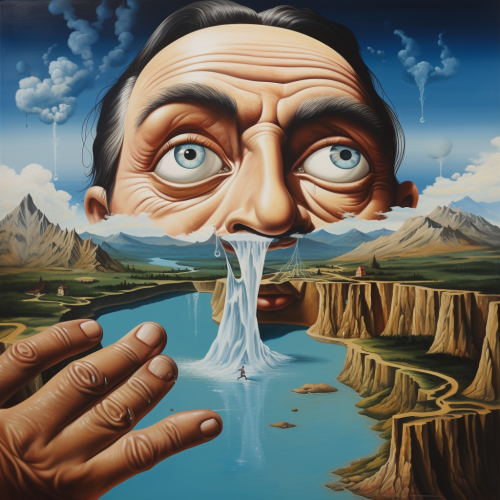 Salvador dali paints a large eyebrow and an eye with paint on canvas, with a brush in his hands, the canvas depicts an eye and eyebrow, with mountains and waterfalls in the background, blue sky, great detail.