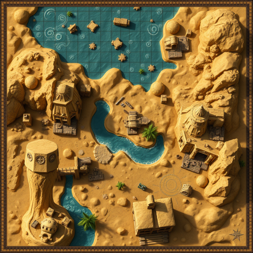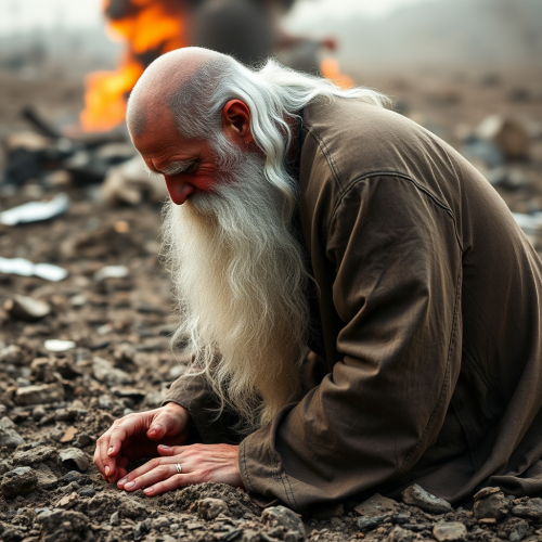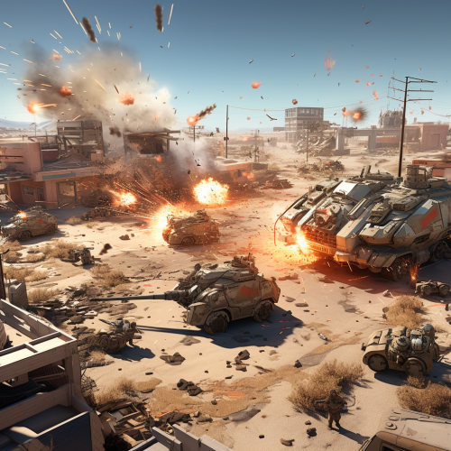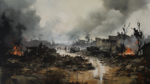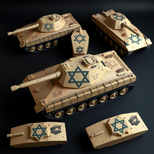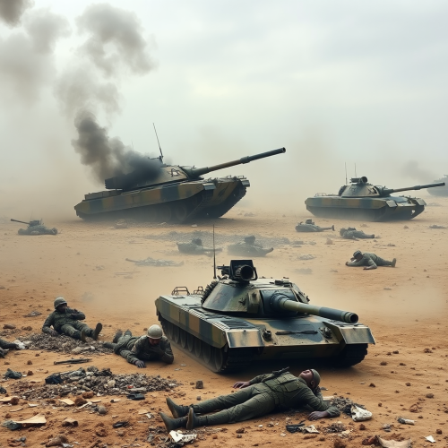 "In a scene that conveys the devastation after a battle, several damaged and burned Merkava tanks are seen upside down in different locations on a barren, debris-strewn field, with the Star of David emblem prominent on them. Black smoke rises from some of them, in a hazy, cloudy atmosphere, while the scenes are covered in dust and debris. A number of Israeli soldiers lie dead on the ground."
