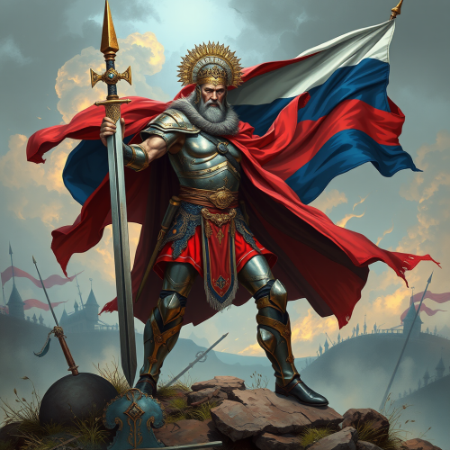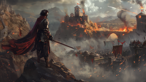 A man wearing armor and holding a knife stood on the cliff, with a group of warriors behind him. They looked at the burning city in the distance. There are tanks and people fighting in the city. --v 6.0 --ar 16:9