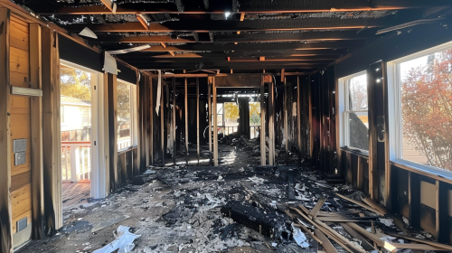 burnt 2x4 stud walls inside a home, fire damage, modern home --ar 16:9 --style raw