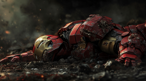 Iron Man hulk buster laying dead on the ground, dramatic composition of bodies, dark settings, fragments of avengers destroyed weapons --v 6.0 --ar 16:9