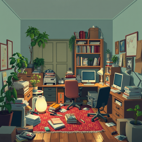 empty corporate photo with invisible employees with visibly empty chairs. Smart devices, hard hats, scrubs, and other professional tools setting on the empty seats.