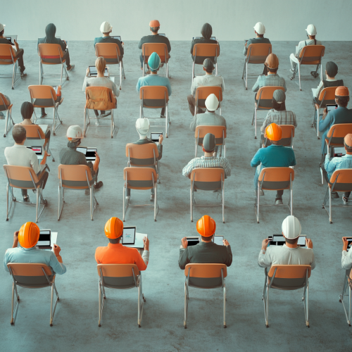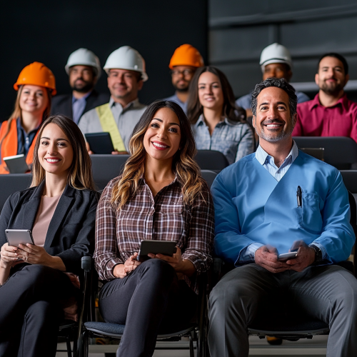 corporate photo with smiling employees with empty chairs with smart devices, hard hats, scrubs, and other professional tools setting on the empty seats.