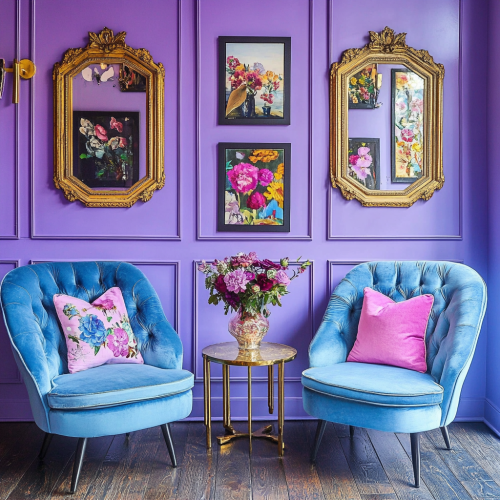 editorial style photo of a chic sitting room with lavender walls. The walls are decorated gallery style with floral framed art, kitschy gold flowers, and mirrors in gold frames. There are 2 bright blue mid-century style chairs with pink pillows