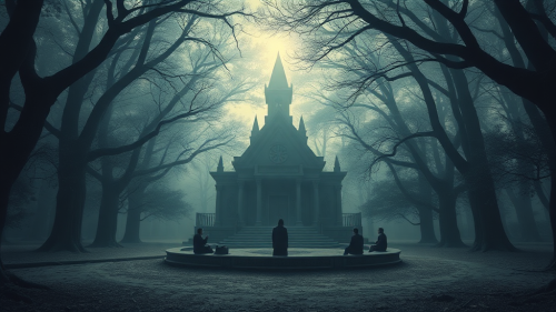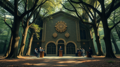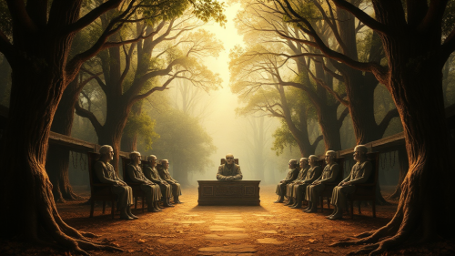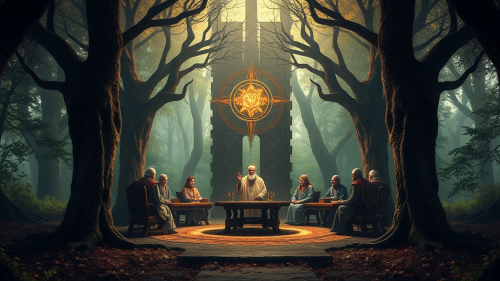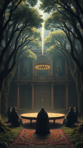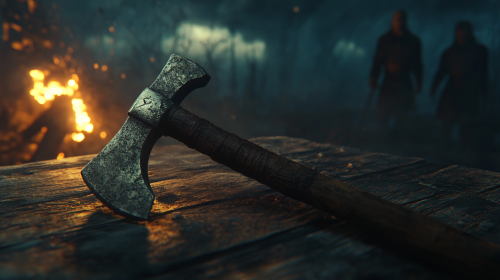 Hyper-realistic 4K cinematic scene depicting Viking justice. Start with a close-up of an ancient Viking axe resting on a wooden table, illuminated by the flicker of torchlight. Transition to a medium shot of a Viking council, with stern, weathered faces debating the punishment of an outlaw, their expressions lit by firelight. The camera zooms in on a solitary figure standing at the edge of a dark, dense forest, looking fearful and desperate. In the background, ominous clouds gather, and a cold wind rustles through the trees, creating an atmosphere of tension and impending doom. --ar 16:9 --v 6.1