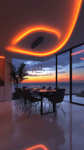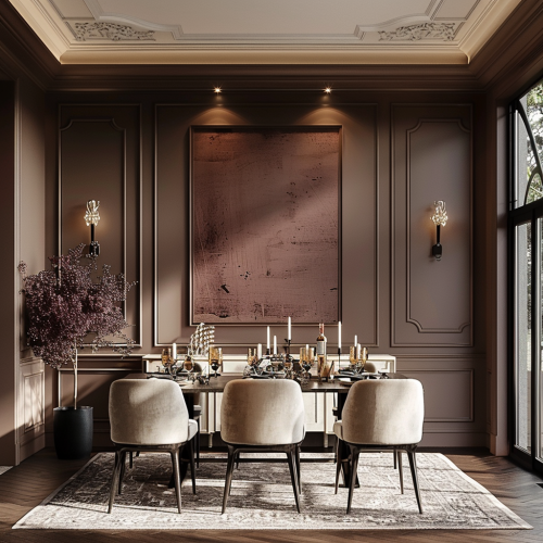 luxury modern organic dining room. A whole room. Deep mauve and brown taupe accent walls with wall molding. Black lined windows. Minimalist abstract brown cream art above cream sideboard. Wall sconces. modern dining cream chairs. Large dining table with candles, wine bottles and plates. Modern area rug. tall green tree in the corner with sky light. tall large vase of purple hydrangea flowers. Dark brown oak floors. Black chandelier. Layer the room with accent pieces. Realistic style --ar 1:1 --v 6.0 --s 250 --style raw