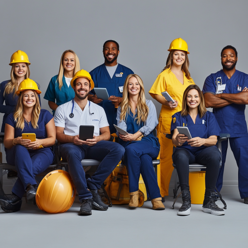 corporate photo with smiling employees with visibly empty chairs. Smart devices, hard hats, scrubs, and other professional tools setting on the empty seats.