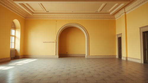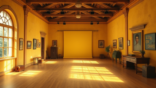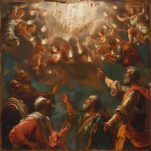 The number of council members is further reduced, now featuring only a handful of individuals who are all focused on Peter, pointing and accusing him without noticing the celestial spectacle above. These few members are vividly expressing their disapproval and condemnation towards Peter, adding intensity to the earthly drama. Meanwhile, Peter remains steadfast, his back to the viewer, symbolizing his resolve and faith. The fiery horses and chariots continue to dominate the ceiling, representing divine protection. The overall composition maintains the contrast between the earthly judgment and the unseen divine support. --s 250