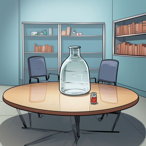 sitting in a large conference room with a circular table in it and three chairs, with an empty whiteboard and one round glass bottle on the table and one bookshelf on the side