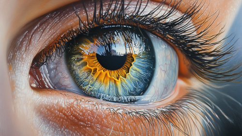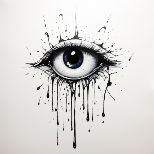 Create a surreal painting with a large eye in the center. This eye should be detailed and expressive, reflecting the infinite cosmos, with stars and galaxies visible in the iris. Drops should cascade from the eye, each containing miniature scenes from different worlds, from bright and colorful to dark and mysterious. These drops, like tears, flow down the surface, creating the effect of reflecting emotions and memories. The background of the painting should be mystical, incorporating elements of outer space to add depth and atmosphere. Use bright and contrasting colors to emphasize the surreal nature of the artwork.
