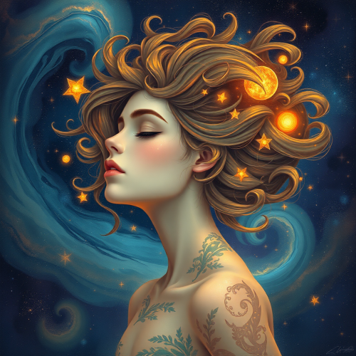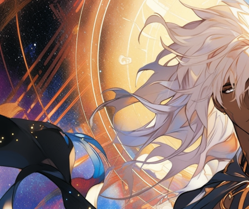 Using an illustrative artstyle, craft a mesmerizing image of a dark skinned divine cosmic being, with flowing white hair that sparkles like starlight and penetrating gold eyes that radiate celestial power. He possesses a handsome and chiseled jawline, his toned physique accentuated by the absence of a shirt. Adorned in vibrant, puffy cosmic pants, he exudes a fierce and badass aura. The character sits elegantly on a black hole suspended in the vastness of space, a symbol of his cosmic dominion. Ensure the camera captures his abs and fit physique, emphasizing his beauty and strength. The image should showcase him wearing stylish sandals, adding a touch of otherworldly fashion. As a unique feature, incorporate ethereal tattoos that glow with cosmic energy across his arms and chest. Another distinctive trait is a celestial crown hovering above his head, adorned with miniature galaxies. For added flair, depict him wielding a cosmic staff that channels the energy of distant galaxies, its glow illuminating his surroundings. Cinematic, Color grading, Editorial photography, Photography, Photoshoot, Shooting on 70mm lens, Depth of field, DOF, Tilt blur, Shutter speed 1/ 1000, F/ 22, whitebalance, 32k, SuperResolution, Megapixel, ProPhoto RGB, VR, large, epic, Artgerm, Alex Ross, semi - backlit, backlight, daylight, incandescent, fiber optics, ambient lighting, film lighting, backlighting studio, soft lighting, volumetric, backlighting, dim lighting, accent lighting, global lighting, screen space global lighting, ray tracing global lighting, red light, 45% cool color calibration, optics, diffusion, glare, shadows, roughness, smearing, ray traced reflections, lumen reflections, screen space reflections, diffraction calibration, chromatic aberration, GB offset, scan lines, [...]