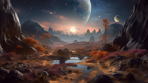 A hyperrealistic cosmic scene, a surreal view of an alien planet bathed in the light of multiple moons, exotic flora and fauna coexisting in an otherworldly harmony, the cosmic atmosphere conveying a sense of serene mysticism, Illustration, digital art with a hyper-realistic rendering approach, --ar 16:9 --v 5.0