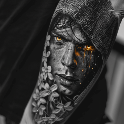 anakin skywalker with hood and yellow eyes from Star Wars revenge of the sith movie as arm sleeve black and white tattoo, with flowers in the foreground and the cosmos and a beautiful woman with tears running down her face in the background, realism, unreal engine