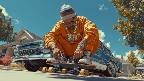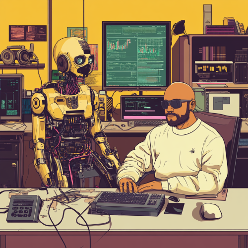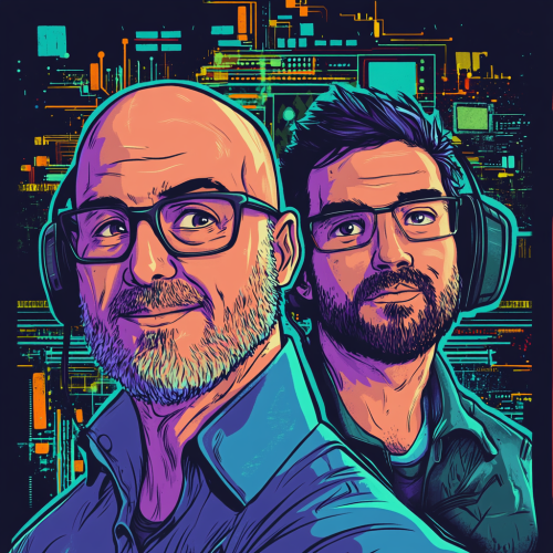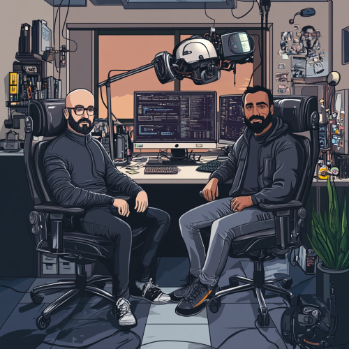 a podcast cover promotional image for a podcast about AI and user experience. It needs to look edgy and mix old school technology with modern big data tech. It should be set in a normal office in the real world but have lots of items in the background with pop culture reference and memes, there should be a nice juxtaposting between the real world and the digital world. It should look like an action movie style, a little bit retro and it should feature 2 main people; one being a white bald man, the other being an indian.