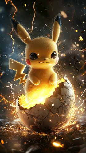 A chibi-style Pichu emerging from a cracked egg amidst glowing energy and swirling light, freshly born, with sparks of electricity surrounding it, dramatic lighting, epic atmosphere, 8K, HDR, high quality, ultra-realistic details --ar 9:16