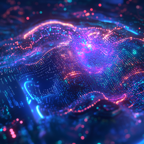 A futuristic setting where complex AI networks are intricately connected, with glowing data streams flowing through. The AI network is visually generating text and content for e-books, with digital screens displaying words and paragraphs automatically forming. The scene is illuminated with vibrant blue and purple tones, emphasizing the innovation and creativity driven by advanced technology. The process of e-books being written with the help of AI is symbolically represented, with ultra-detailed elements and neon lighting effects creating a futuristic atmosphere. --v 6.1
