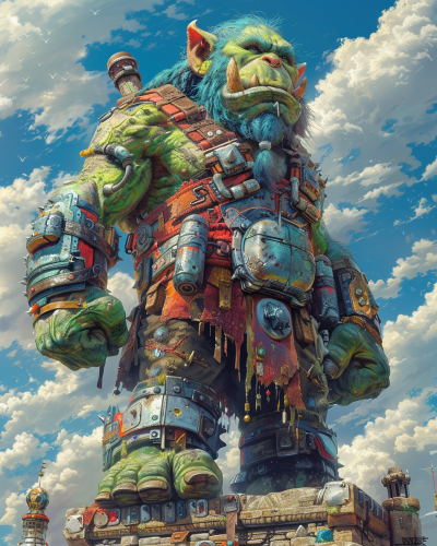 a high resolution cartoon style illustration of An Orc stronghold where ancient Nordic strength is combined with cyber-enhanced weaponry , blue sky, white clouds, afternoon, rendered in a colorful cartoon style, with bright colors and clear lines , well detailed, colorful, eye pleasing --ar 4:5 --s 500 --v 6.0 --chaos 20