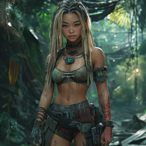 a realistic image of this sci-fi character: an ugly young female Asian member of the M’Bora Tribe, in her 20s, lean but strong, with hard, masculine features, blond dreadlocks with pieces of tech woven in, and piercing blue eyes that seem to see more than the jungle. She wears tribal garb fashioned from salvaged ship parts and the hides of jungle creatures.