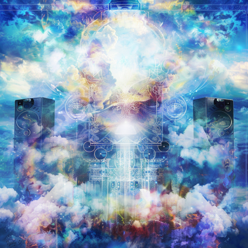 Digital art of sky atmoshpere with clouds and dj speakers around, radiant energy white aura; an ethereal background filled with sacred symbols and glowing light effects; Spiritually colors; a surrealistic style, with Spiritually colors like Azure, cerulean, and sky-blue sapphire gemstones --v 6.0 --style raw