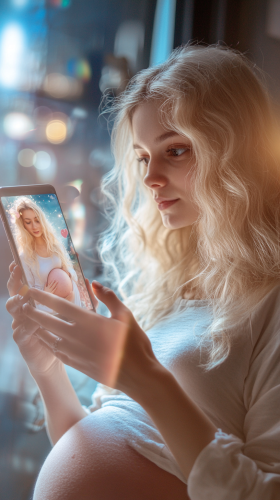 Create an image where a young blonde italian woman is holding a smartphone, looking at the screen with a mix of curiosity and surprise. On the phone's screen, there is a realistic depiction of herself with a visible baby bump, as if she is using a pregnancy filter on Instagram. The filter subtly alters her appearance to show her as pregnant, while keeping the background and the phone’s interface intact. The setting is modern and well-lit, emphasizing the contrast between her real self and the digital transformation displayed on the phone. --ar 9:16