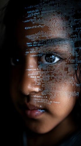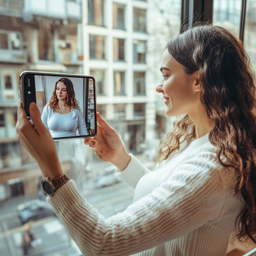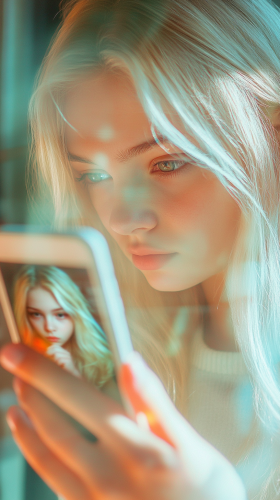 Create a photograph of a young blonde woman holding a smartphone, gazing intently at the screen. On the phone’s display, she sees a reflection of herself as a child, as if she’s using a nostalgic Instagram filter. The filter should transform her current appearance into a younger version of herself, showing her with childhood features and attire. The setting should be contemporary, with natural lighting that highlights both the woman and the screen. The focus is on the emotional impact of seeing her past self through the digital lens --ar 9:16 --v 6.1