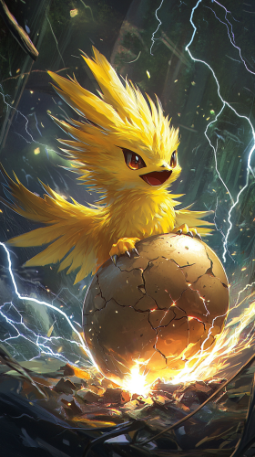 A chibi-style Zapdos, with its striking, electric golden feathers and formidable, electrified wings, bursting forth from a cracked, storm-charged egg. The scene is engulfed in a tempest of roaring lightning and electrifying energy, with intense, dynamic bolts of lightning streaking across the scene. Zapdos’s emergence is highlighted by dramatic, radiant flashes and a swirling vortex of electric power, creating an awe-inspiring and epic atmosphere. The lighting and storm effects emphasize Zapdos's commanding presence, in 8K, HDR, high quality, ultra-realistic details --ar 9:16