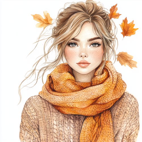a beautiful girl wearing a cozy sweater, with fall colors, watercolor illustration hand drawn, the air is of wamth, earthtone colors and scents of fall, nature walks, digital painting clipart, isolated on white background