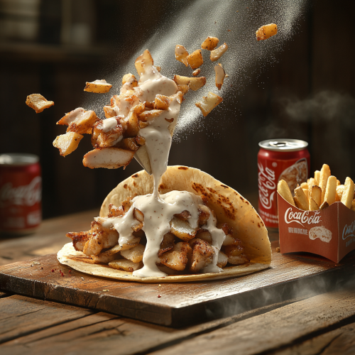 A very realistic side image of a tacos consisting of a thin, toasted Armenian teak loaf closed in the form of a sandwich containing pieces of white chicken and fried potatoes with melted white sauce in an advertising manner, so that part of the chicken pieces, fried potatoes and white sauce are flying over the sandwich in the air in an advertising design. Artistic, so that smoke rises from it, and the white sauce appears in an advertising manner. Next to this sandwich is a box of french fries with ketchup sauce in an advertising manner, and next to them is a can of Coca-Cola that appears in an advertising manner.