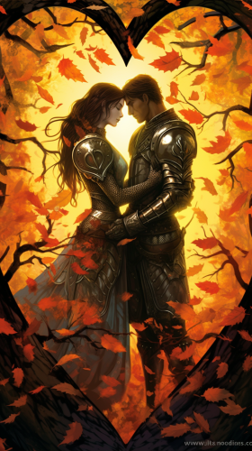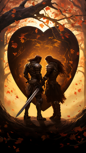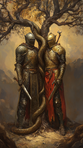 Two, geminis, warriors, lovers, medieval fantasy, Heart shape, union, heavy armors, digital painting, tree of life with snake around the trunk, tarot, Franz Frazetta Style, fantasy, --ar 9:16