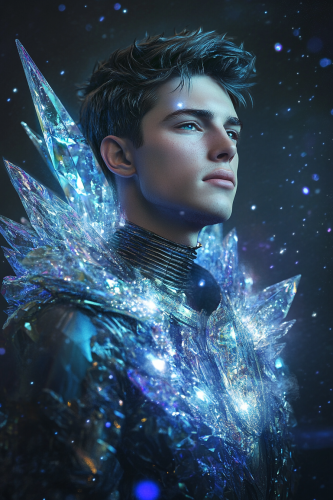 Illustration, handsome androgynous young man with futuristic crystal clothing, galaxy background, divinity, fantasy, realistic, fantastic, extremely detailed and complex, elegant, --ar 2:3