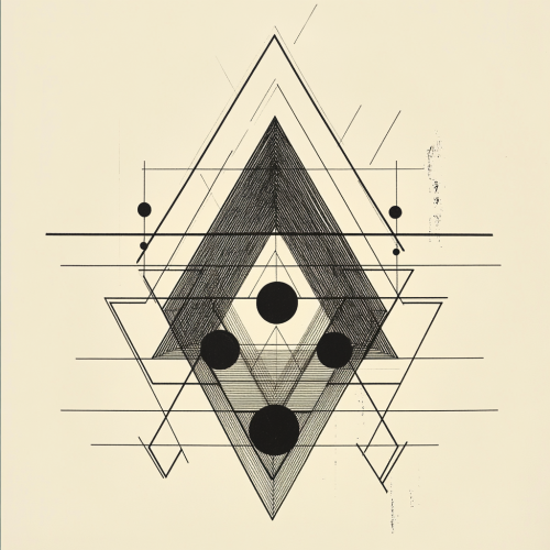 a set of geometric symbols, arranged in an upside down pyramid, straight black lines and acute angles, the center symbol is a straight line and has no angled corners, each symbol in a clockwise direction has one more angled corner added to the shape