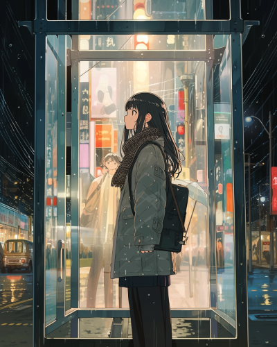 A girl waiting at a bus stop in Tokyo, looking around curiously with her back to us, in the style of anime, flat color illustration, street view of busy streets and buildings, traffic lights, street lamps, reflections on glass windows, light rain falling from the sky, high resolution, high quality, high detail, sharp focus, studio photo, intricate details, highly detailed, digital painting, artstation, concept art, smooth, sharp focus, bokeh background --ar 4:5 --niji 5