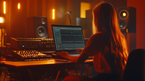 cinematic scene, a firl sits in front of her laptop and the sound system with an audio program open, rhythmically tapping the keys, extreme long shot, warm colors, cinematic lights, 4k --ar 16:9
