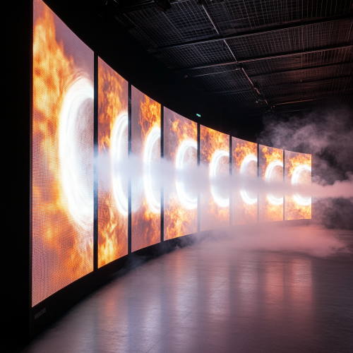 curved wall with large scale video wall in a museum. a line of very clearly defined smoke rings emerge from the floor in front of the screens, rising upwards magestically to the ceiling leaving whisps of smoke in the air. patterns are shown on the screens behind the smoke rings, following their movement them as they rise beautifully. high powered lighting in the ceiling gives an orange glow through the smoke filled space