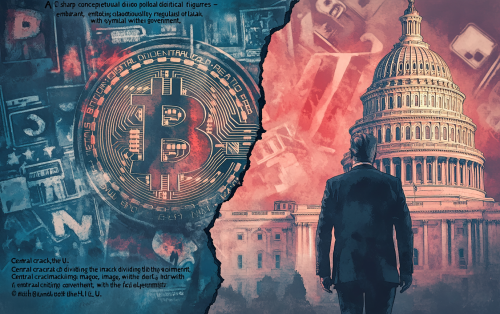 "A sharp conceptual divide between two political figures--one embracing vibrant, chaotic digital cryptocurrency symbols like Bitcoin and NFTs, the other cautiously regulating with symbols of law and government. Central crack dividing the image, with the U.S. Capitol in the blurred background. Color pencil shading with marker lines, realistic and detailed." --ar 8:5